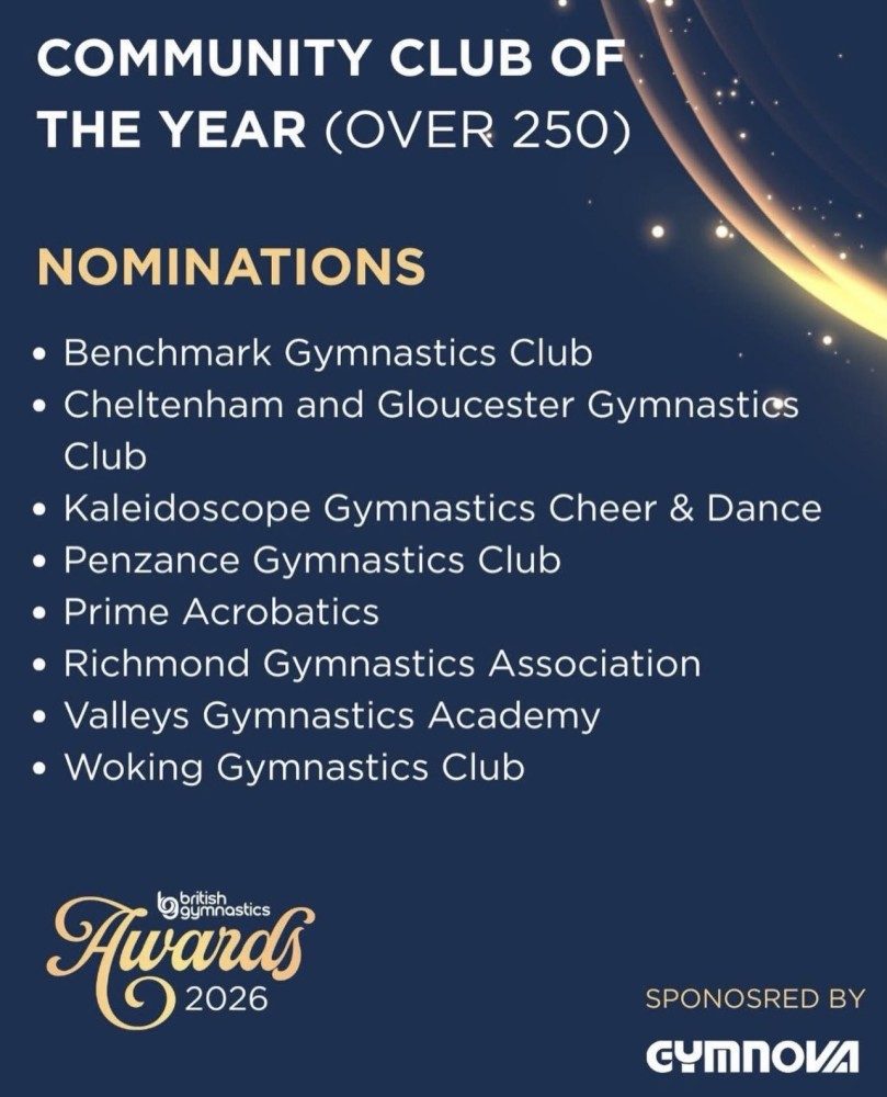 We are delighted to announce that we have been nominated for 'Community Club of the year' for the 2026 British Gymnastics National Awards, after being crowned BGNI Club of the year 2025.